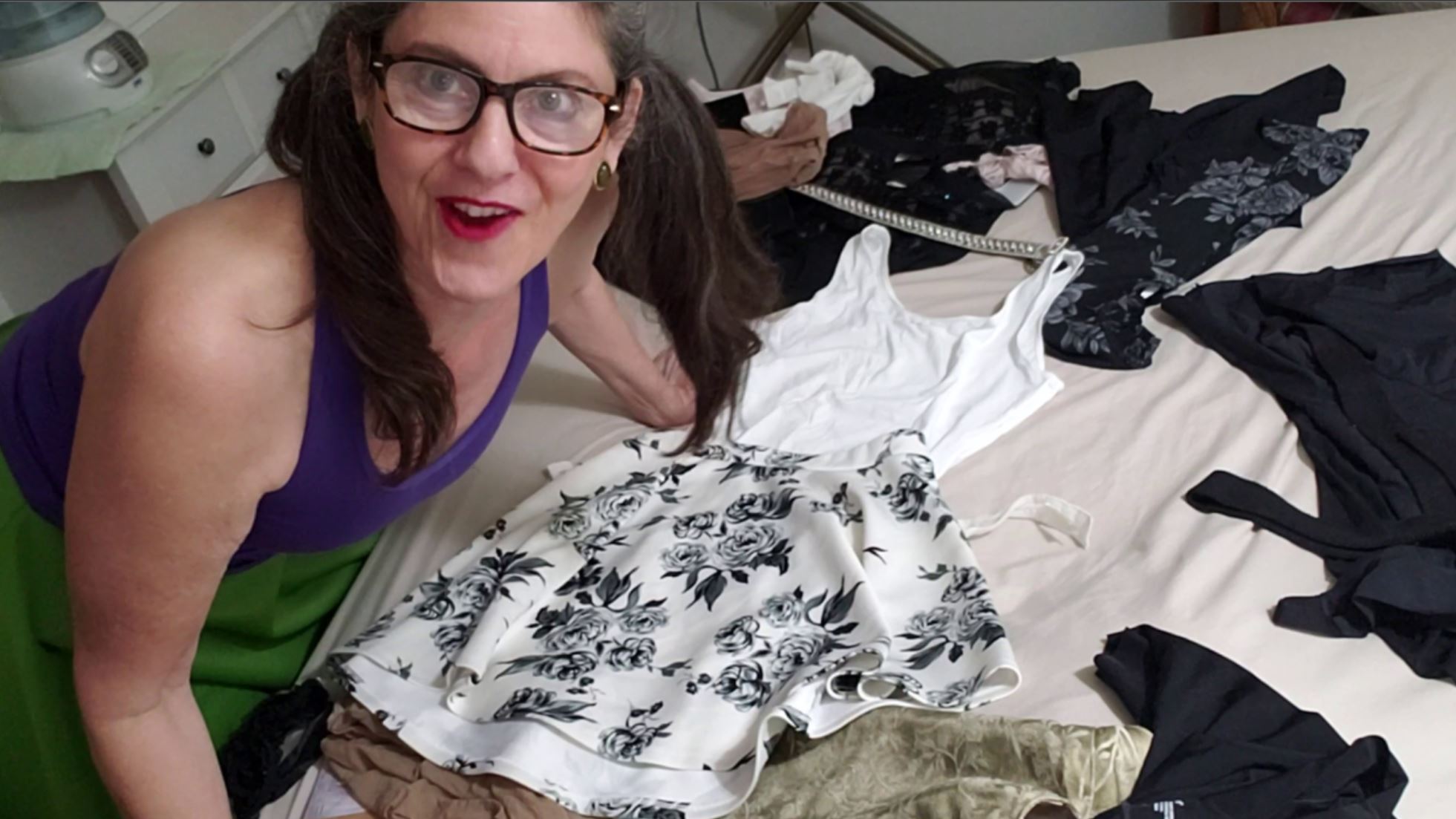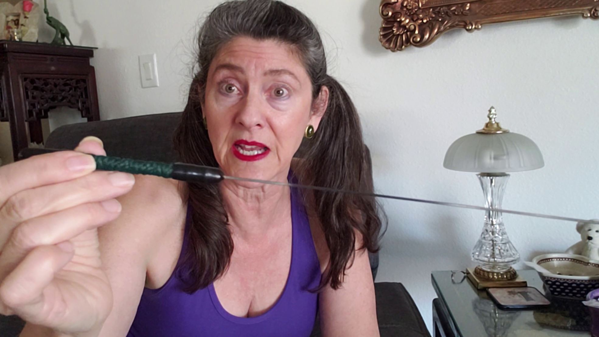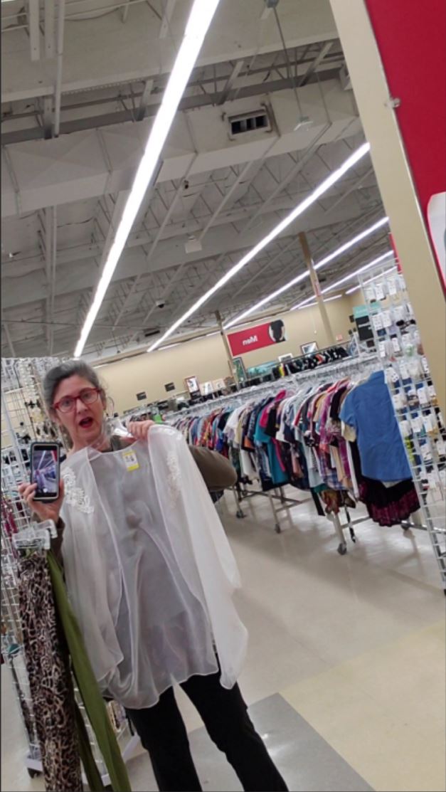 Below are screenshots from videos I shot today. What are these videos, you ask? One is my reviewing new implements that I’ve been graciously gifted. Another I’m selecting the implements that will make it into my red bag this time. (All of my toys want to accompany me…) And then I actually took them shopping for new items. Lastly, of course, the review of outfit possibilities!